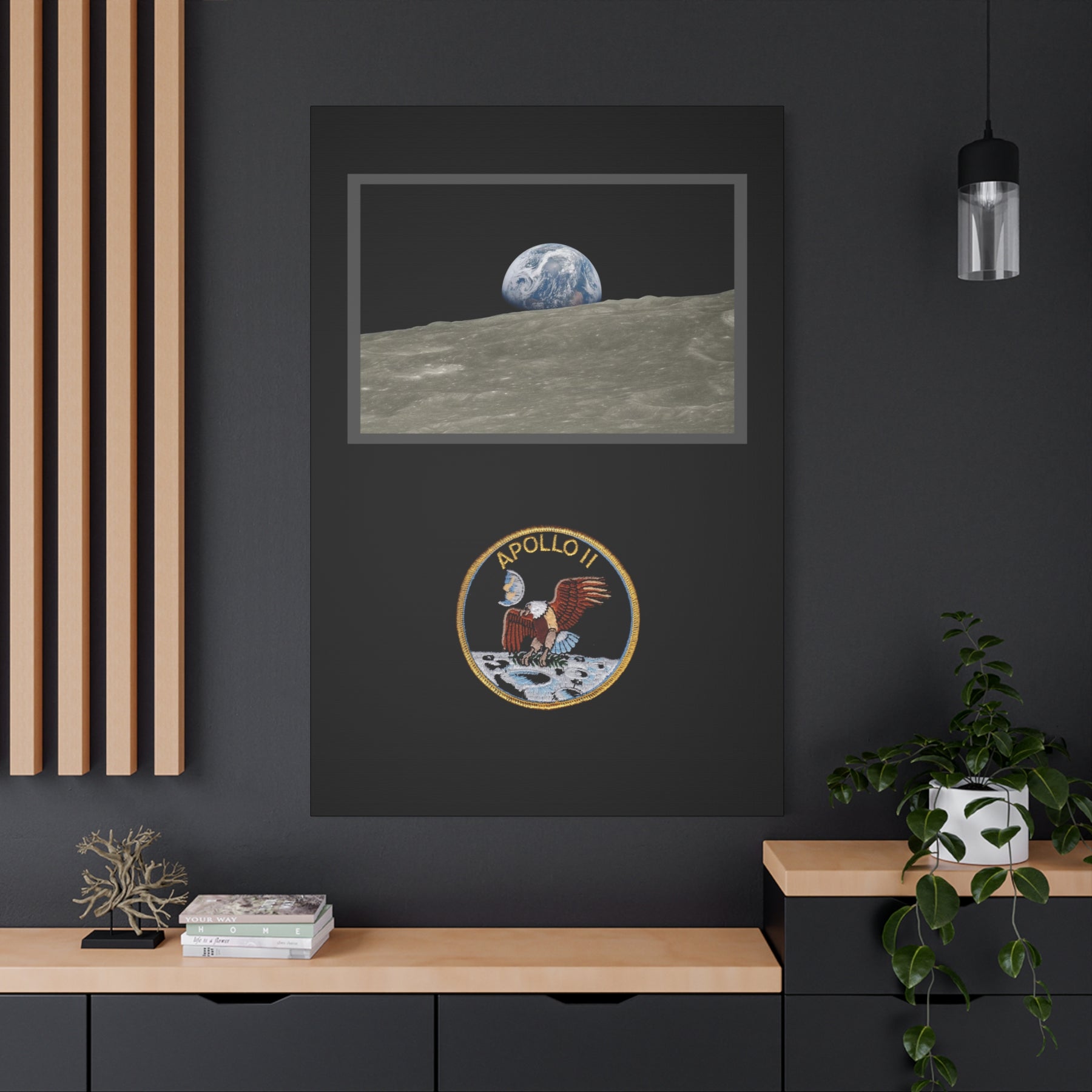 A matte stretched canvas print that brings the hush of lunar horizons into your space. Deep black margins frame a photographic view of Earth rising above the moon’s surface, paired with the historic Apollo 11 patch beneath. The image carries a quiet, museum-like presence — muted textures, true-to-tone colors, and a satin-matte finish that reduces glare. Lightweight yet sturdy, it arrives ready to hang with a built-in back hanger and soft rubber feet to protect walls. The natural pine stretcher and archival latex inks create a responsibly made piece that feels both nostalgic and reverent — an artwork that sits calmly on a study wall, next to a model rocket, or above a bedside shelf where late-night stargazing conversations begin.
